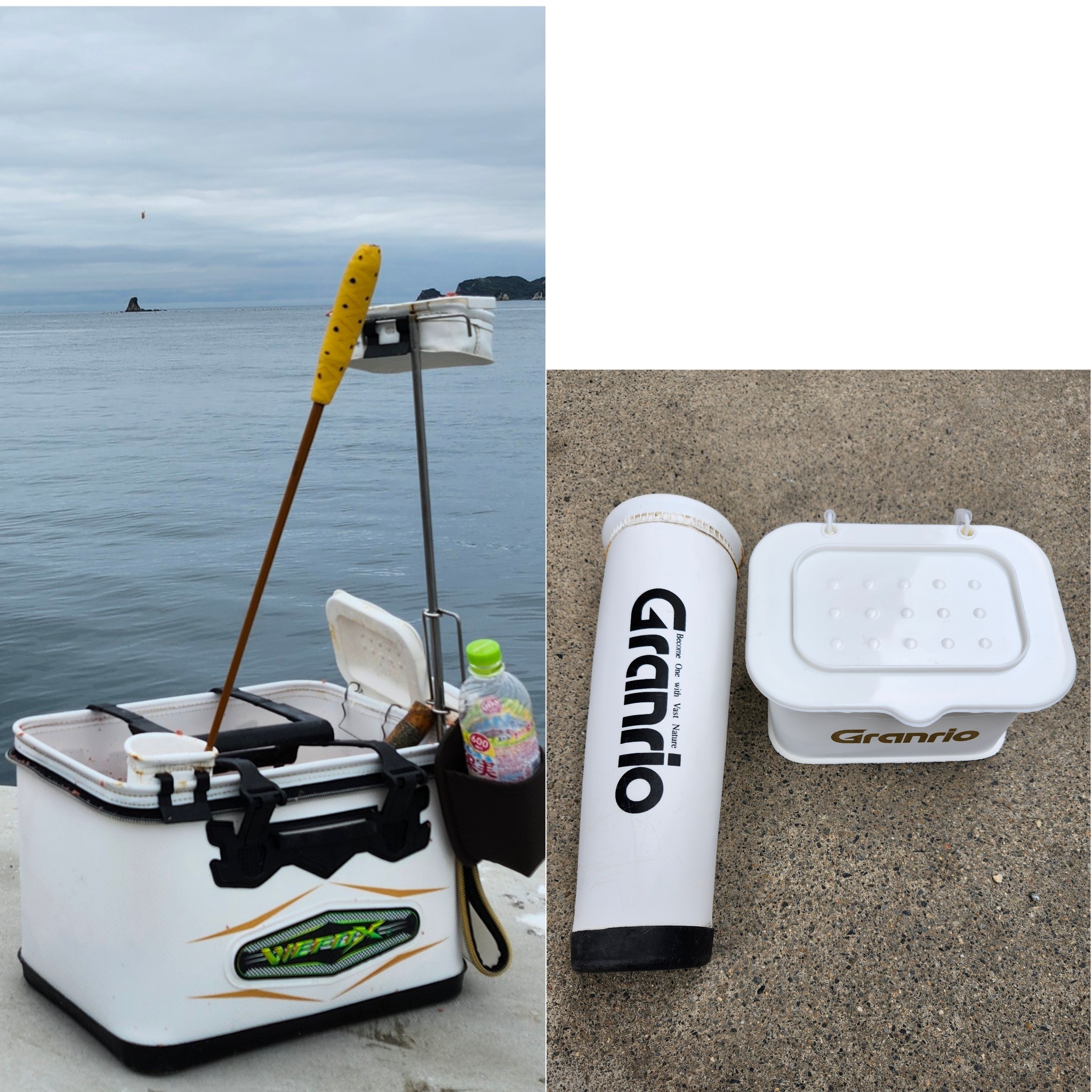 ➀V-FOXハードバッカン…厚手EVAを採用してるので耐久性バツグンで型崩れしないから、マキエを杓でバッカンに押し当てて、固めて遠投しやすいです。少々粗い磯場でも底部が強く補強されて擦り切れにくいので、私は40cmの白を好んで使っています。強靭な作りでリーズナブルな値段なので絶対にお買得です。